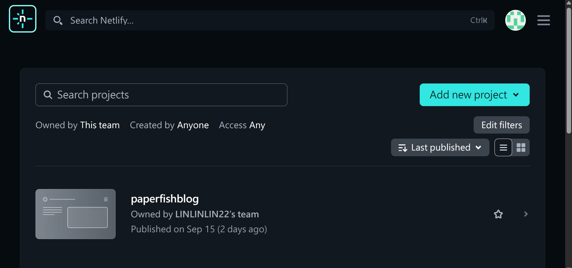 再來到 Netlify的網站上用 GitHub 帳號登入,首次使用時系統會自動指引你 add new project,如果非首次使用可以在這裡看到: