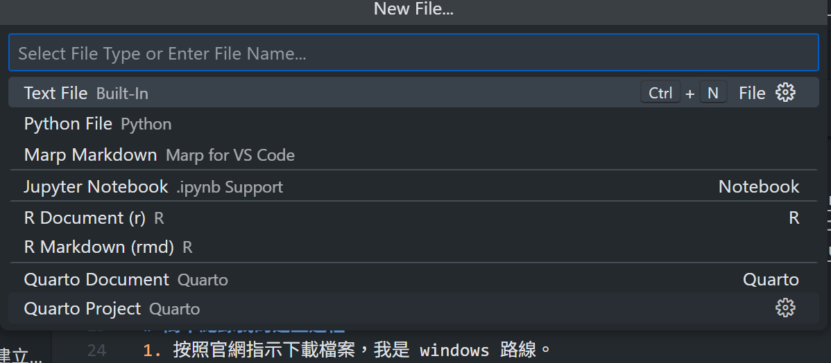 - 按照官網指示,在 Vscode 安裝 Quarto 的 Extension。