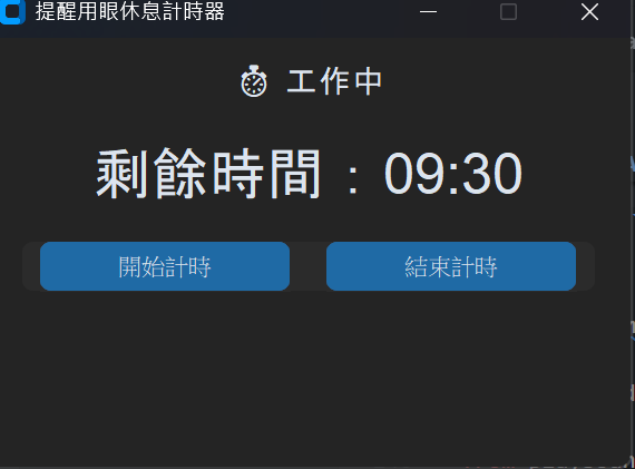 - 每30分鐘跳視窗提醒休息5分鐘,使用者按按鈕再繼續計時。
